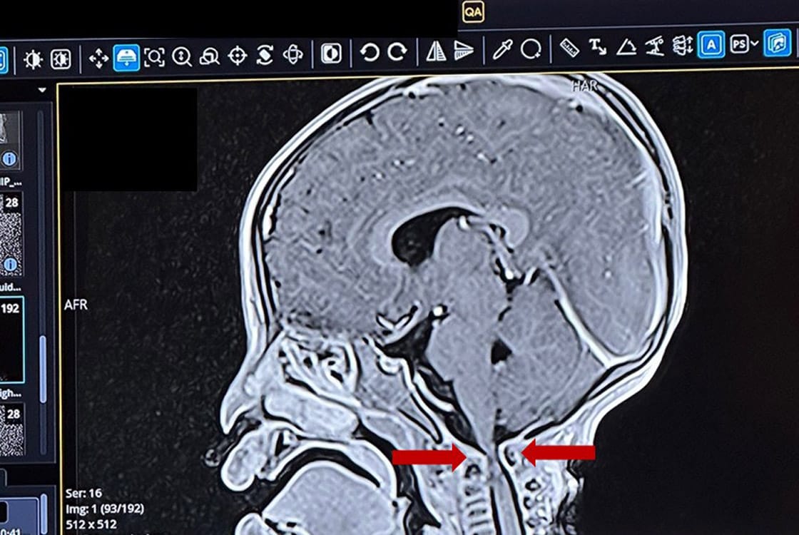 welches Schicksal hinter diesem Bild steckt, ist nicht zu fassen. Emilys Eltern hatten alles versucht. Ärzte konsultiert, Kliniken abgeklappert. Drei Jahre lang. Ihre Tochter kann nicht sitzen. Nicht laufen. Eine schwere Spastik beeinträchtigt alle vier Gliedmaßen. Letzte Woche kam sie zu unserem Kinderarzt Dr. Christian Reibold. Gemeinsam mit Dr. Martina John ordnete er eine MRT-Aufnahme von Kopf und Halsbereich an. Der Befund war eindeutig: Im Bereich des 1. Halswirbels ist das Rückenmark extrem zusammengedrückt. Emily brauchte sofort eine neurochirurgische Operation.